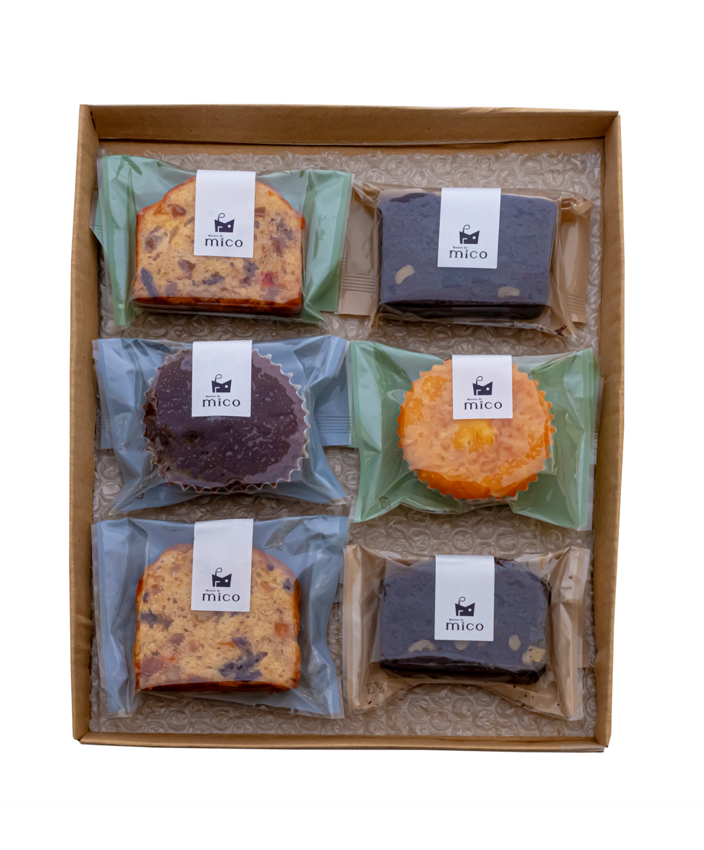 ・ブラウニー×2、・熟成フルーツケーキ×2、・アマンドマドレーヌ×1、・ショコラマドレーヌ×1 計6個