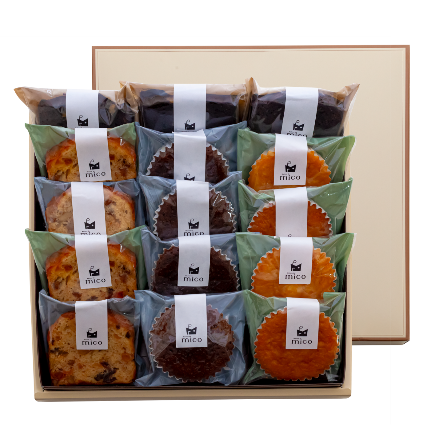 ・ブラウニー×3、・熟成フルーツケーキ×4、・アマンドマドレーヌ×4、・ショコラマドレーヌ×4 計15個